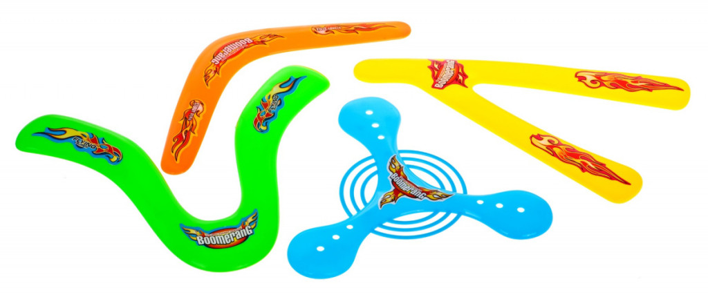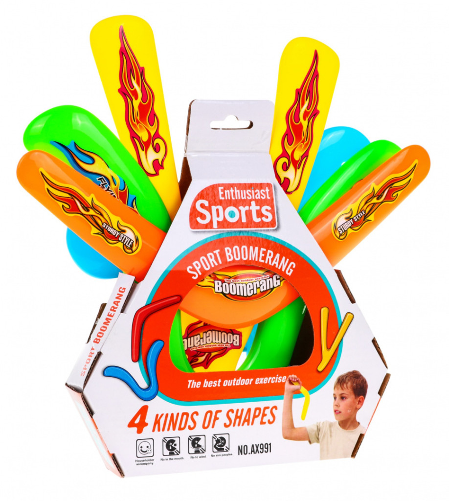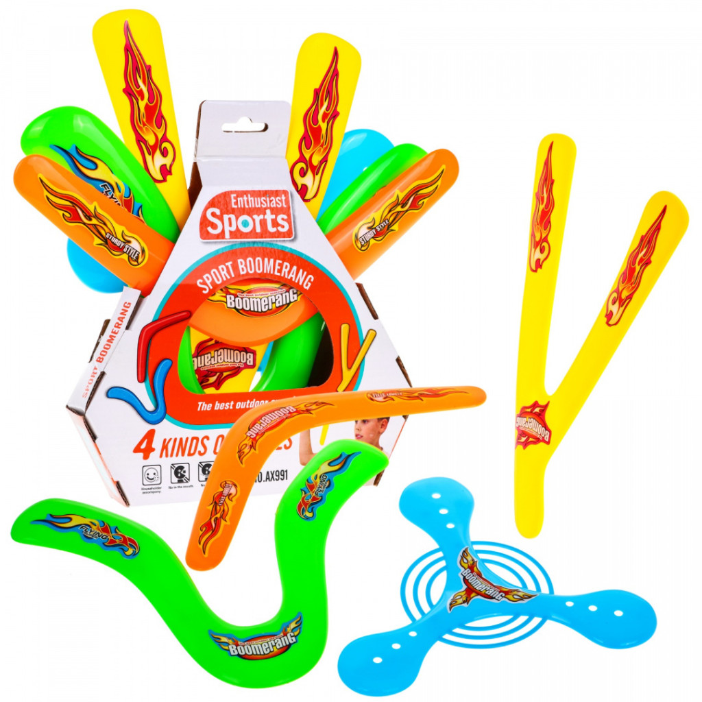 Zestaw 4 bumerangów w różnych kolorach i kształtach to zabawka sportowa przeznaczona dla dzieci od 3-go roku życia. Zapewni Twojemu dziecku kreatywną zabawę na świeżym powietrzu. Zabawa  bumerangiem rozwija zwinność, celność, uwagę i szybkość reakcji. Bumerangiem można bawić się samemu lub zespołowo.