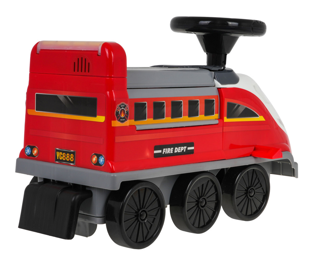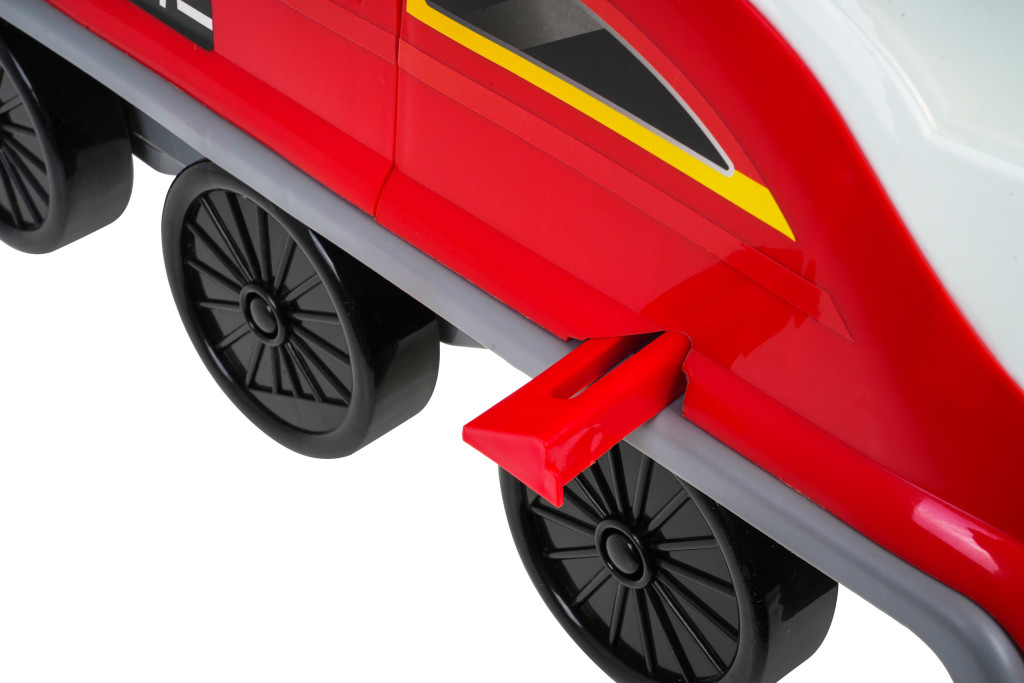 | | Interaktywny jeździk-lokomotywa z parkingiem straży pożarnej i efektami dźwiękowymi oraz świetlnymi to propozycja dla dzieci od 3-go roku życia. Zabawka wykonana została z wysokiej jakości, wytrzymałego i nietoksycznego tworzywa sztucznego. Lokomotywa posiada 6 kół w tym dwa przednie skrętne. Pod siedzeniem znajduje się rozkładany parking policyjny ze zjeżdżalniami, ruchomą windą, otwieranym szlabanem, podnośnikiem oraz obrotowym kółkiem. Wszystkie ruchome elementy sterowane są ręcznie. Pod parkingiem jest dodatkowo schowek na skarby dziecka. Również z przodu lokomotywy mamy otwieraną szybkę przednią z wolną przestrzenią na różne drobnostki. Boki lokomotywy wyposażono w wysuwane podnóżki dla dziecka. Zabawka zasilana jest bateriami typu 2 x 1,5V AA – kierownica oraz bateriami typu 2 x 1,5V AA – panel dźwiękowy, w zestawie brak baterii. W kierownicy umiejscowiono przycisk uruchamiający kolorowe migające światełka. Z tyłu lokomotywy jest natomiast panel dźwiękowy z przyciskami po naciśnięciu, na które słychać melodie, opowiadania oraz odgłosy zwierząt. Lektor posługuje się językiem angielskim. Lokomotywa ma świecące światełka przednie. Funkcje: - przycisk świetlny w kierownicy – migające różnokolorowe światełka, - panel muzyczny z tyłu lokomotywy z muzyką, opowiadaniami i odgłosami zwierząt, - świecące światła przednie, - stabilna konstrukcja, - 6 kółek, - ruchoma kierownica, - ruchome koła przednie, - rozkładany parking pod siedzeniem, - ruchome elementy parkingu, sterowane ręcznie – winda, szlaban, podnośnik, obrotowe kółko, - schowek na drobiazgi pod parkingiem i na przodzie lokomotywy pod szybką imitującą przednią szybę lokomotywy, - wysuwane podnóżki po bokach jeździka. |
