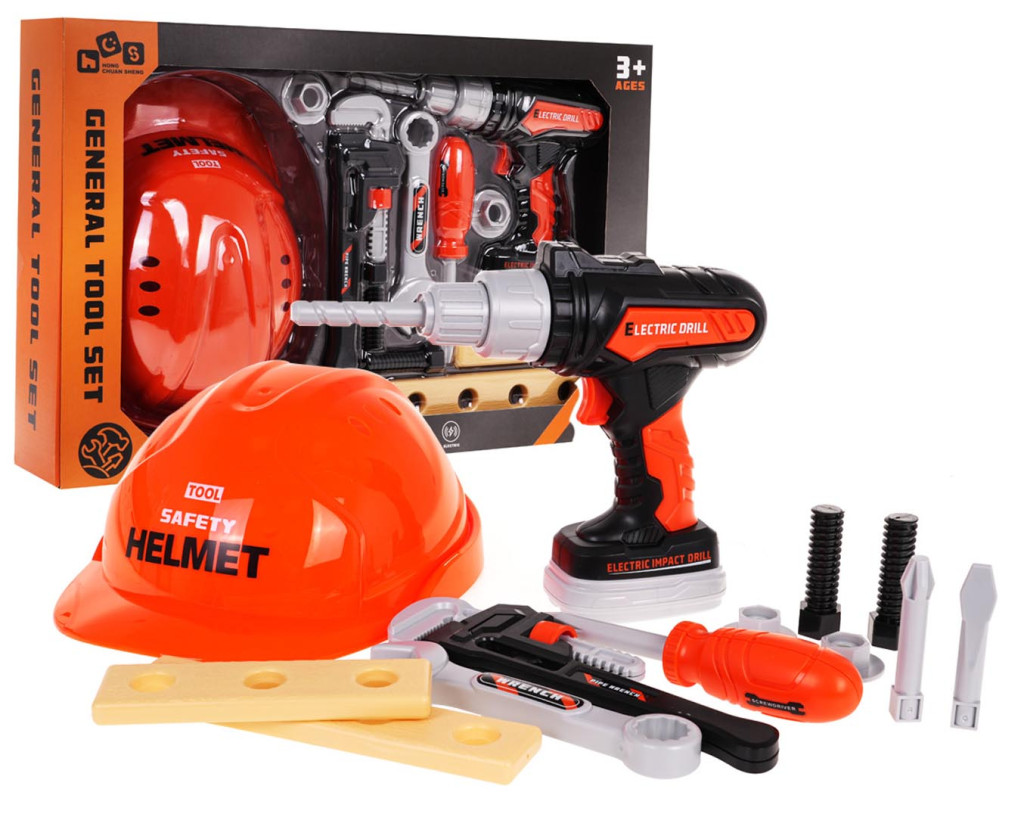 Wymiary | - kask ok. 22 cm x 17 cm x 9 cm, - wiertarka ok. 15 cm x 16 cm x 5 cm, - śrubokręt ok. 15 cm x 3 cm, - bit krzyżakowy i płaski oraz wiertło ok. 6,5 cm długości, - klucz francuski ok.17,5 cm x 5 cm x 1,5 cm, - klucz ok. 14 cm x 4 cm x 1,5 cm, - śrubki ok. 5,5 cm x 2 cm, - nakładki na śrubki ok. 3 cm, - deseczka mała ok. 12 cm długości, - deseczka duża ok. 16 cm, - opakowanie ok. 42 cm x 27 cm x 8 cm. |